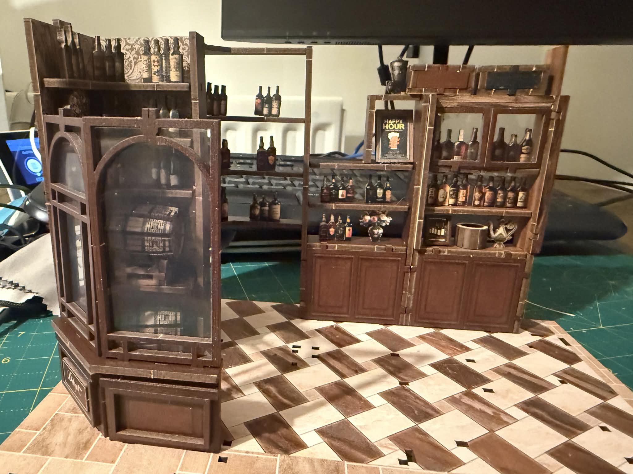 Even though the background bottles are 2D once you have the front on they are very realistic. There are a couple of pieces which you need to glue and I would definitely recommend B7000 glue from Amazon. Never be tempted to use super glue on any model. As they get more complex you sometimes need to take pieces apart. This is impossible with super glue, I learnt on my firt kit! B7000 is very forgiving and has at least a 5 minute setting time; even if you realise much later you can gently separate and the wood doesn’t break (depending on the quality of the kit).