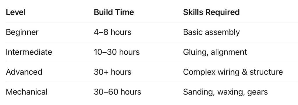 Build time is typically 10–30 hours, depending on how detailed the builder wants the final result to be.