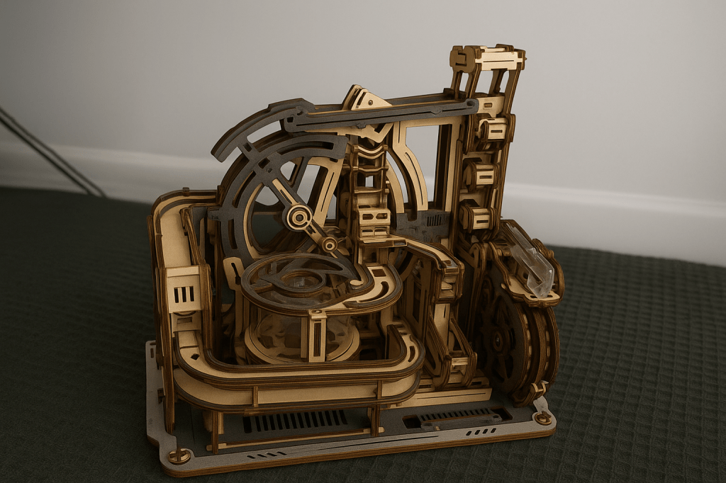 Unlike traditional book nooks or static wooden kits, this model introduces motion and mechanical engineering. It’s a fascinating build that combines wooden gears, gravity tracks, and ball bearings to create a continuously moving marble system.