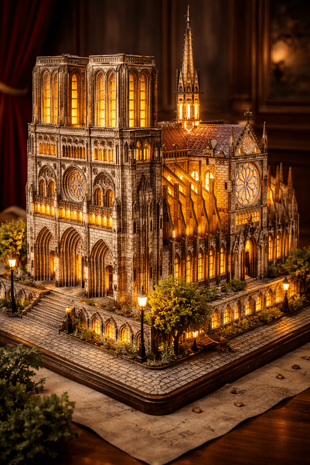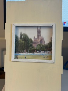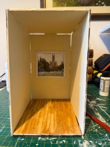 One of the most crucial parts of the interior was to create a rear window looking at the cricket with Worcester Cathedral in the background. I used acrylic black pen on inside of window pane, attached Perspex behind the frame, added a 3mm frame to add the picture, which creates depth and then attached the picture. I use matte photo paper so there is not much of a reflection