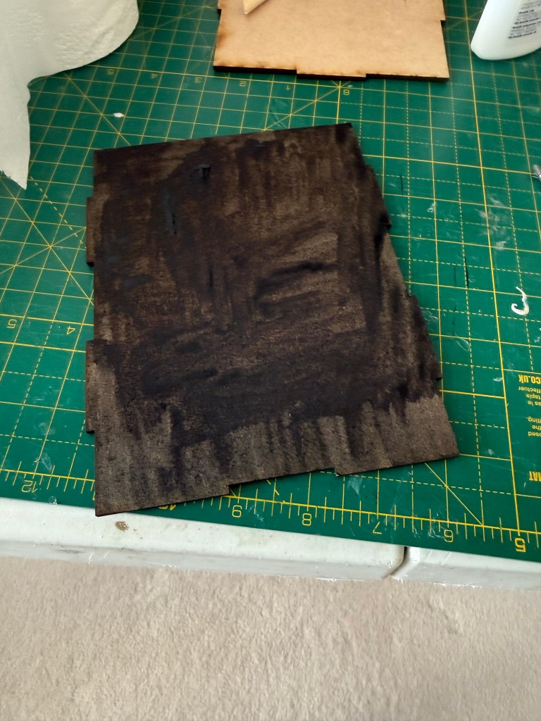 The first step is to prime the MDF. Be careful, if you are using wood stain on the exterior walls then this should be on the untreated MDF. After first coat has dried, lightly sand and do a second coat. I was also having a window in the rear wall so I cut this out and stained the floor in black so no light colour shows through after I attach the floorboards