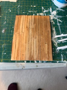 I cut out approximately 5mm strips of basswood for the floorboards; it was not necessary to create identical size boards as this is created around an old fashioned pavilion where there would have been gaps. I used a teak stain for the colour. Apply with a cloth, wait 40 seconds, then wipe with a dry cloth. After 2 hours apply the second layer
