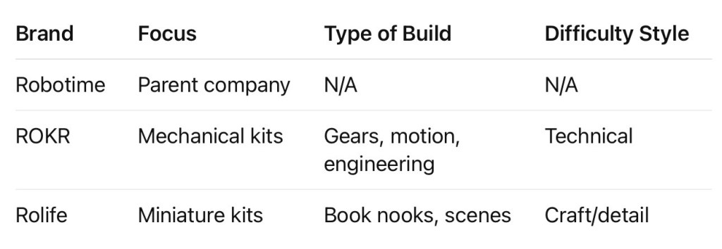Robotime, ROKR, and Rolife aren’t competing brands—they’re part of the same system.