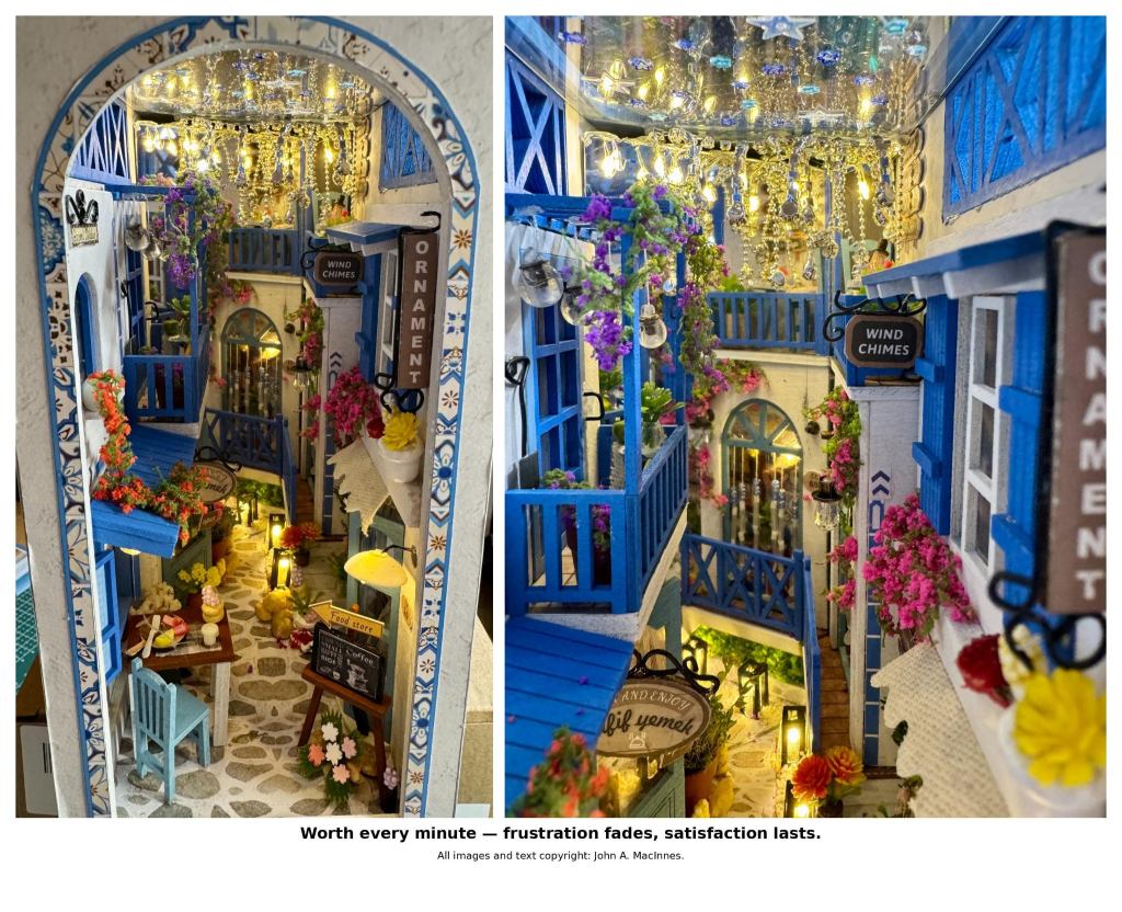 And here’s the thing — when you finally place that last piece, tuck in the final wire, and flick the switch to bring the whole scene to life, the sense of accomplishment is like no other. You don’t just finish this kit — you survive it. And once it’s sitting proudly on the shelf, glowing away like a tiny Mediterranean street at sunset, you’ll look at it and think, “That nearly broke me… but I’d absolutely do it again.”