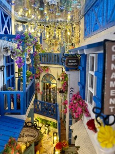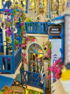 At this stage, I decided it was time to enter Customisation Mode. Honestly, hacking up some small plastic flower elements I’d bought from another online supplier just made far more sense to me. I also introduced some ready-made material to create bougainvillea-style vines climbing up the façade. Not only was it less fiddly, it instantly lifted the whole scene and gave it that sun-drenched Greek island feel — like a tiny alleyway you’d wander through on holiday, minus the glue on your fingers.